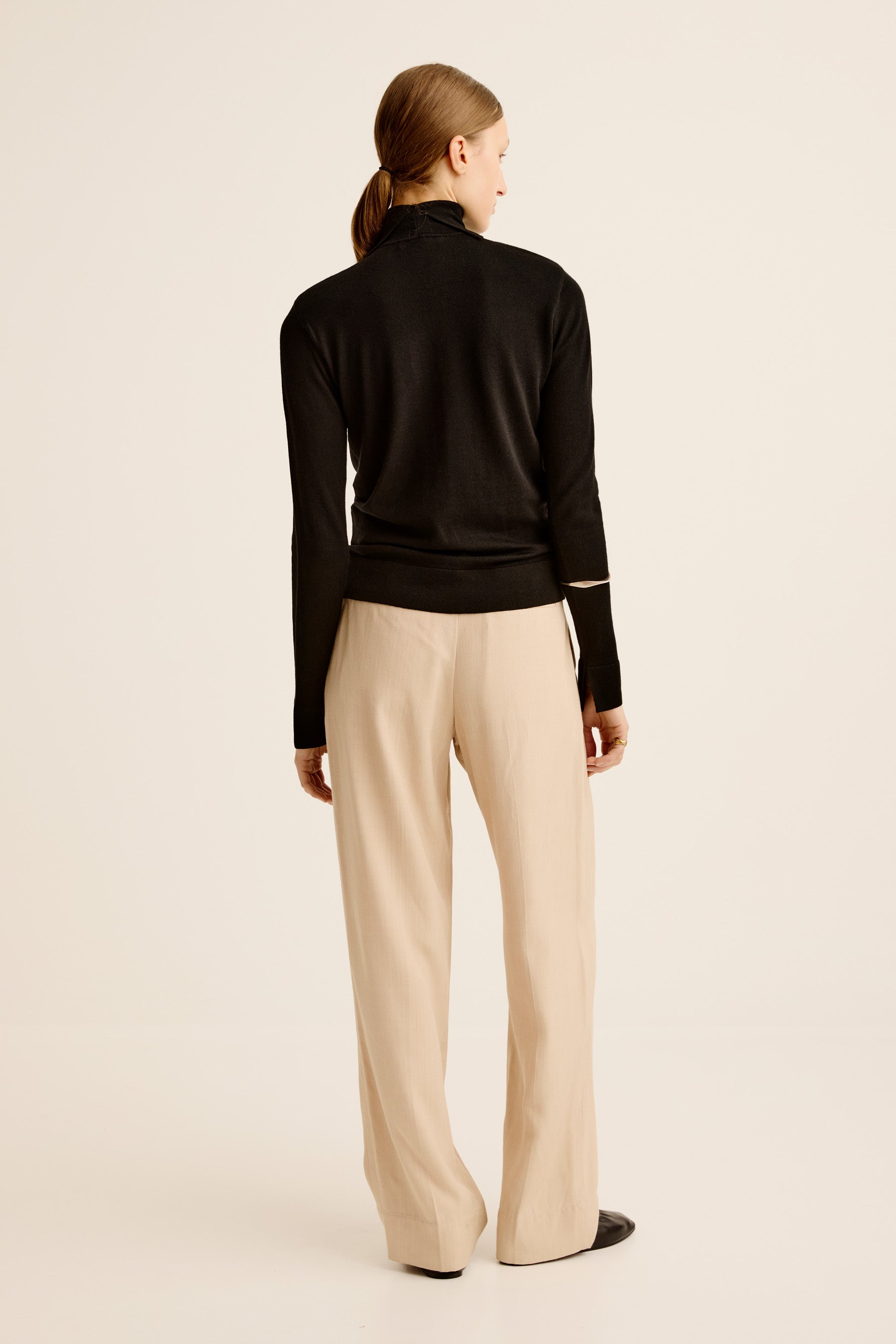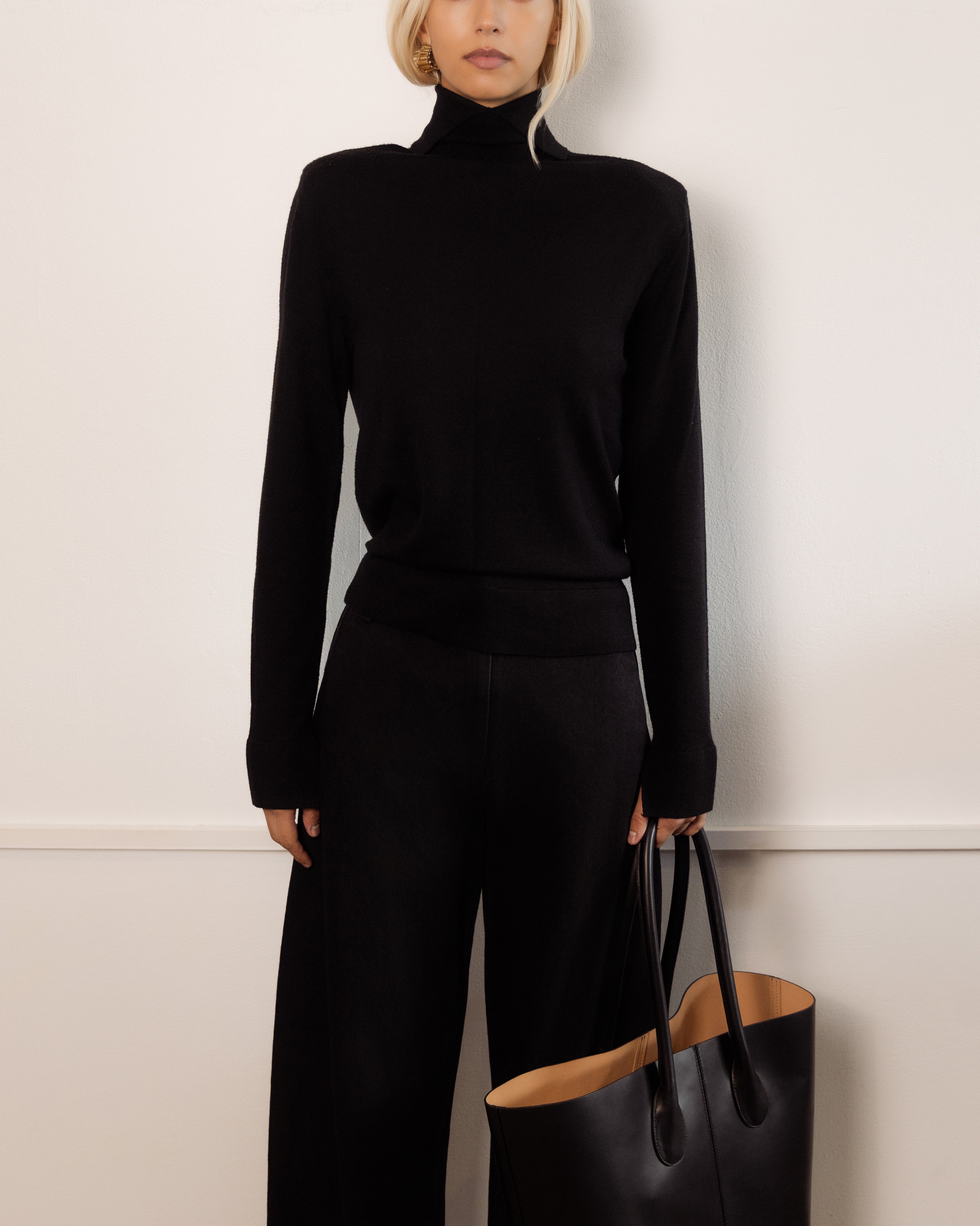 This Merino Turtleneck is a refined foundation piece — lightweight yet warm, with a relaxed slim fit that skims the body. The elongated, sculptural neckline and subtle sleeve splits lend a sense of quiet drama to this timeless wardrobe classic.