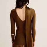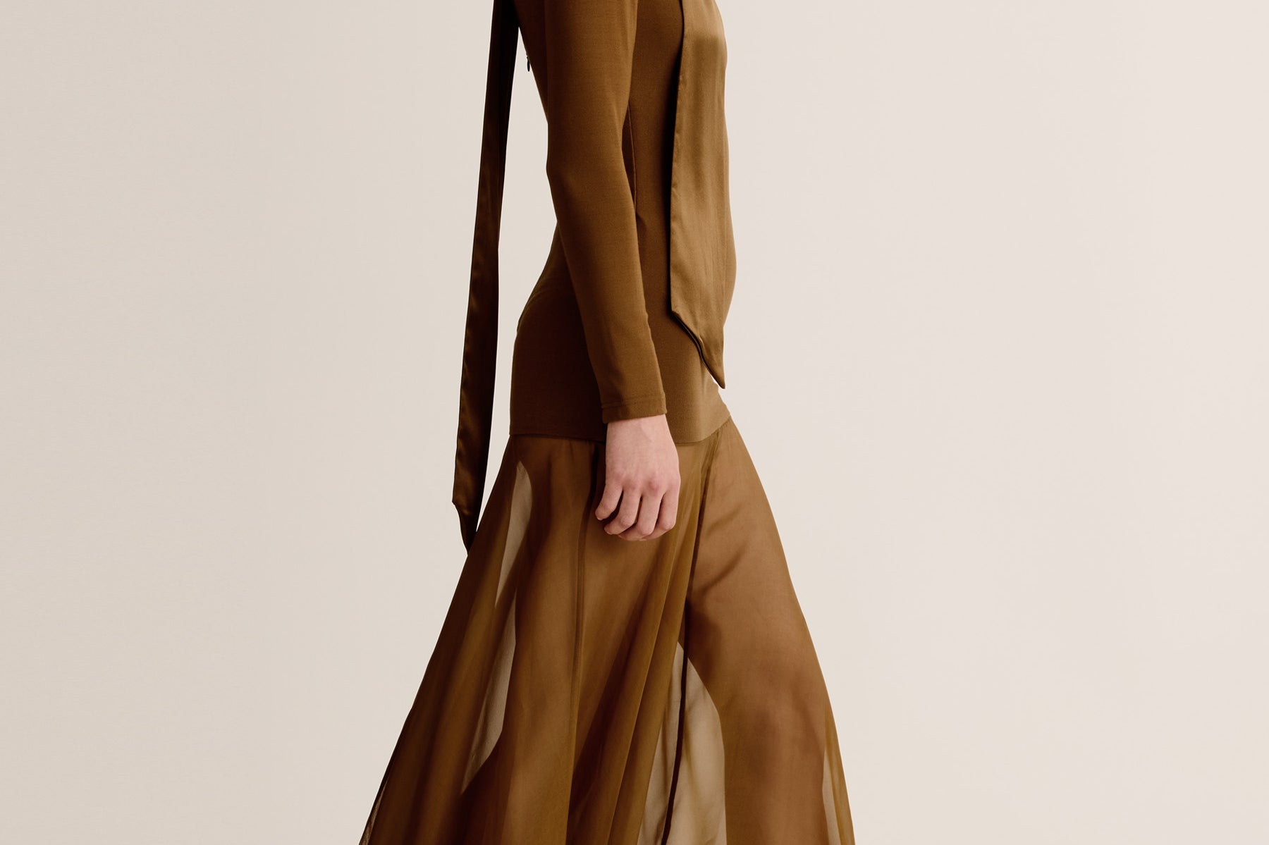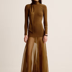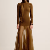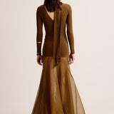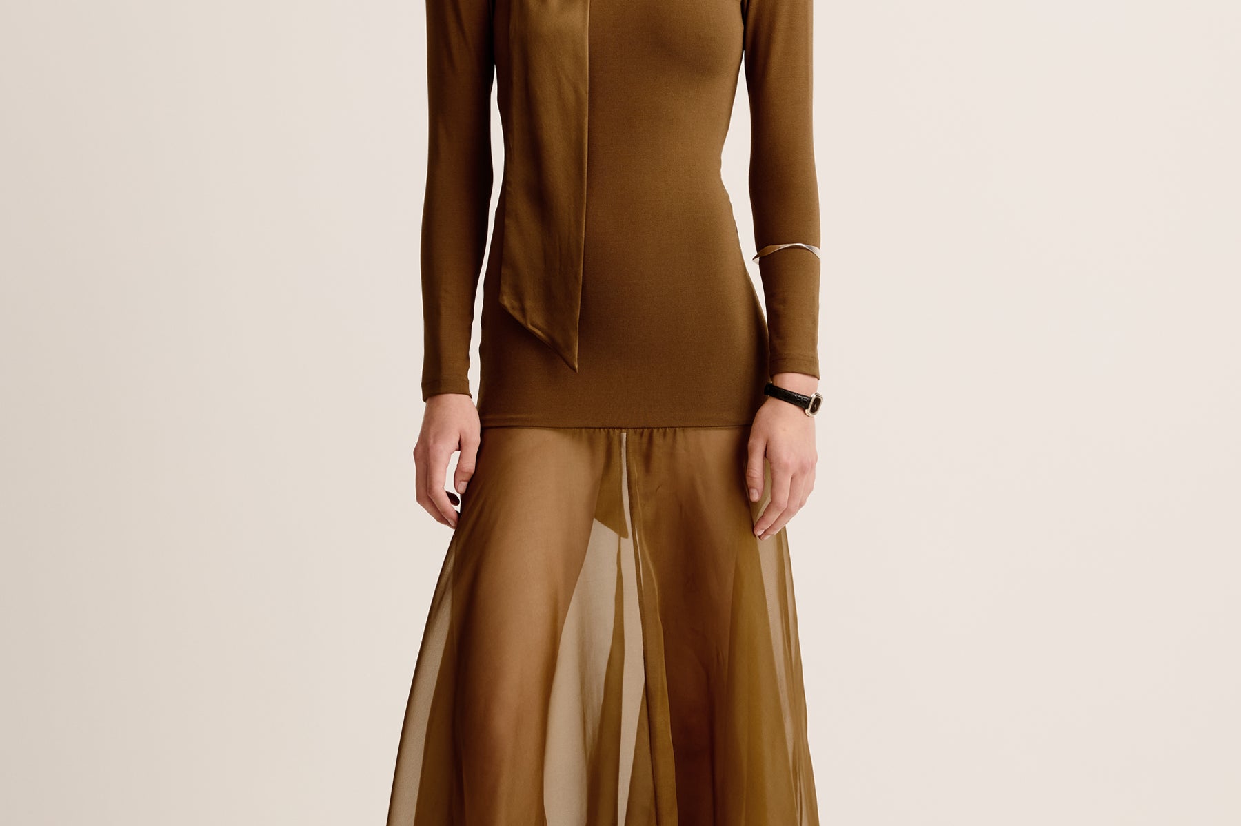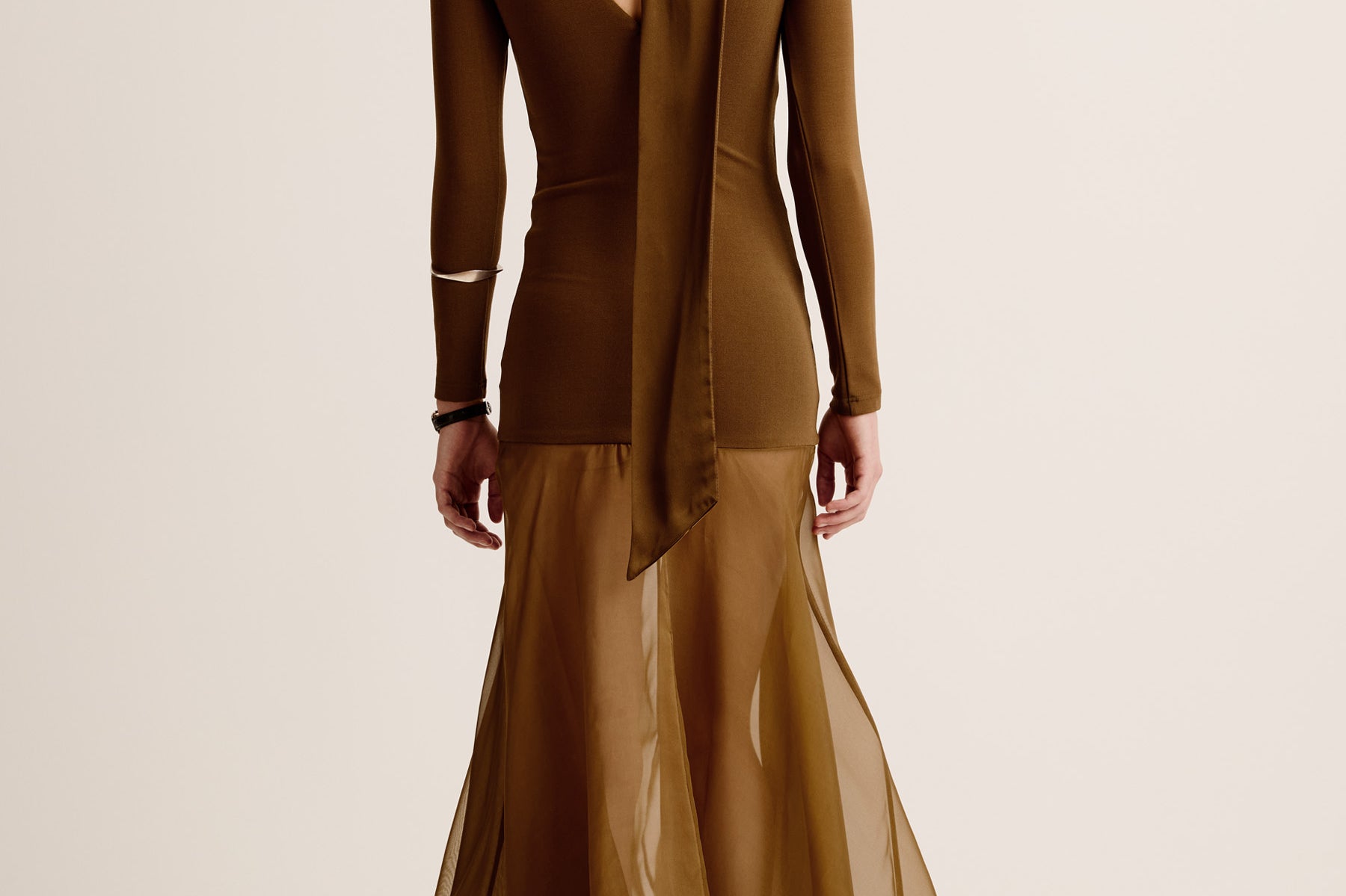 ESSE's signature combination dresses have evolved with this statement event look. An effortless elegant, occasion piece featuring a stretch knit mini dress, silk neck tie and dramatic sheer full skirt silhouette. A forever piece.