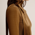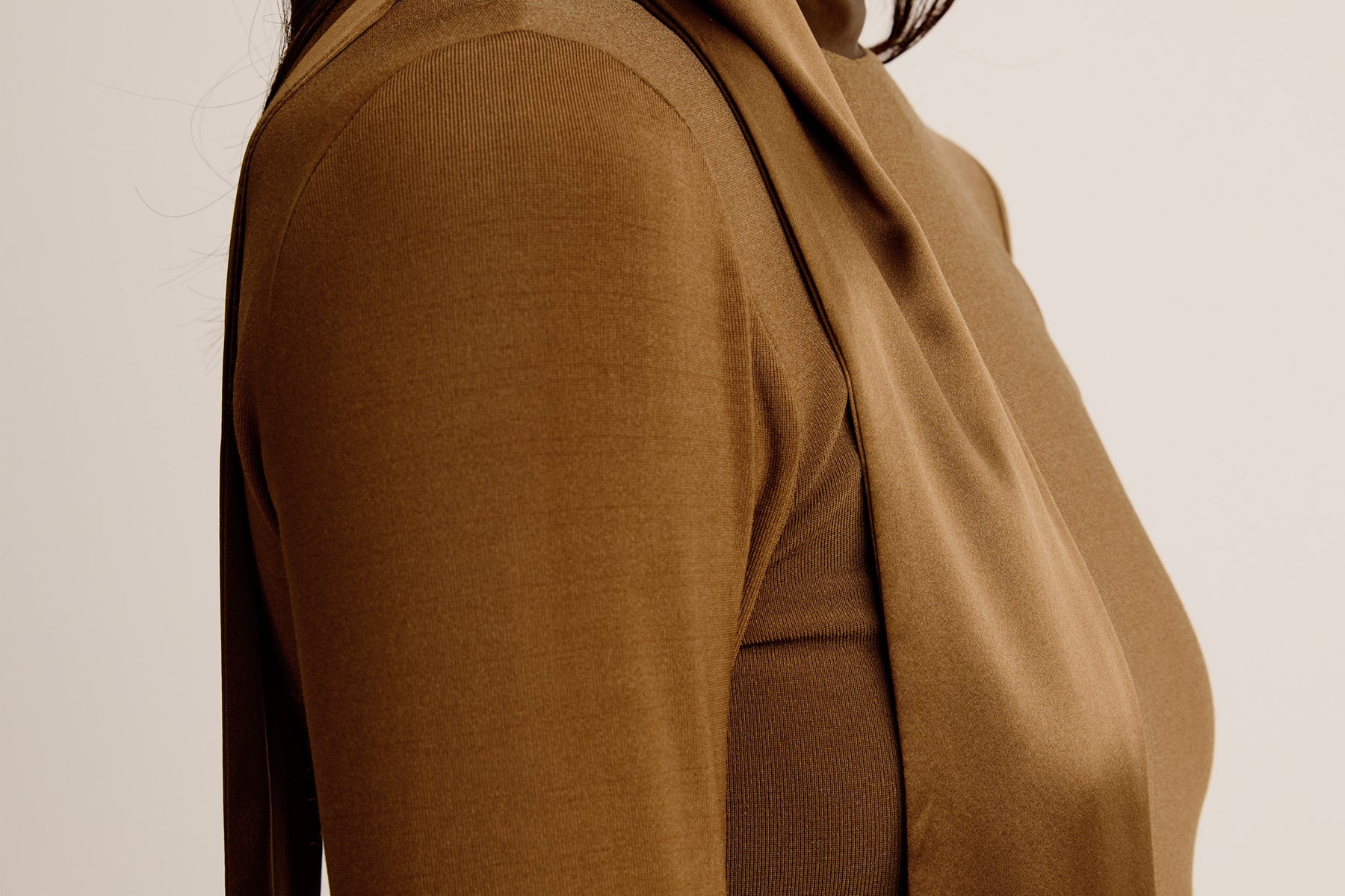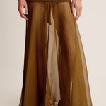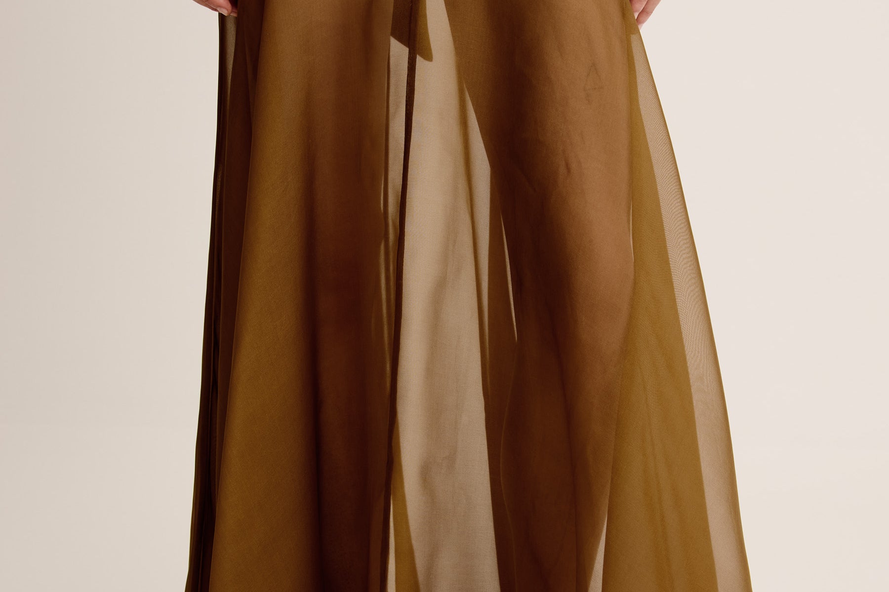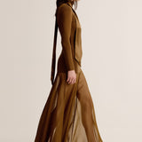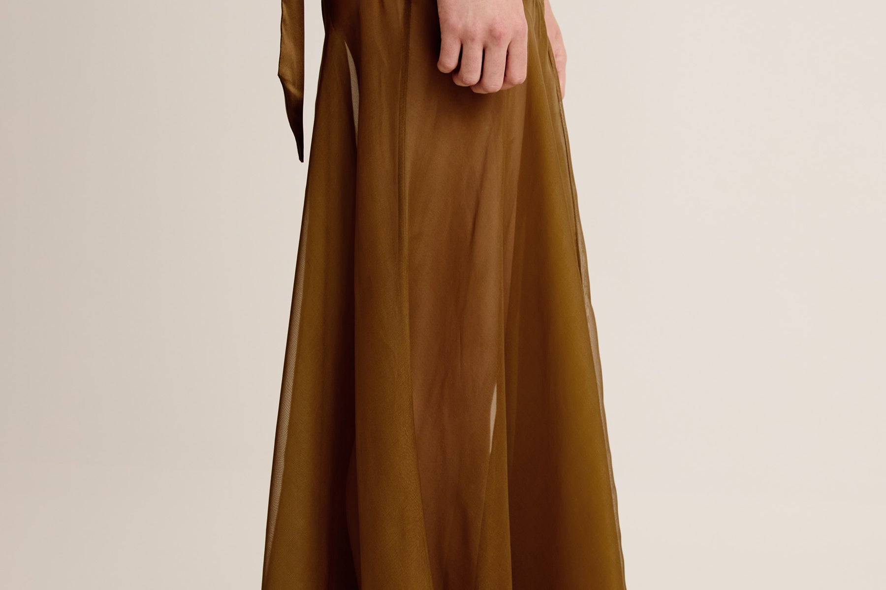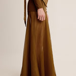 ESSE's signature combination dresses have evolved with this statement event look. An effortless elegant, occasion piece featuring a stretch knit mini dress, silk neck tie and dramatic sheer full skirt silhouette. A forever piece.