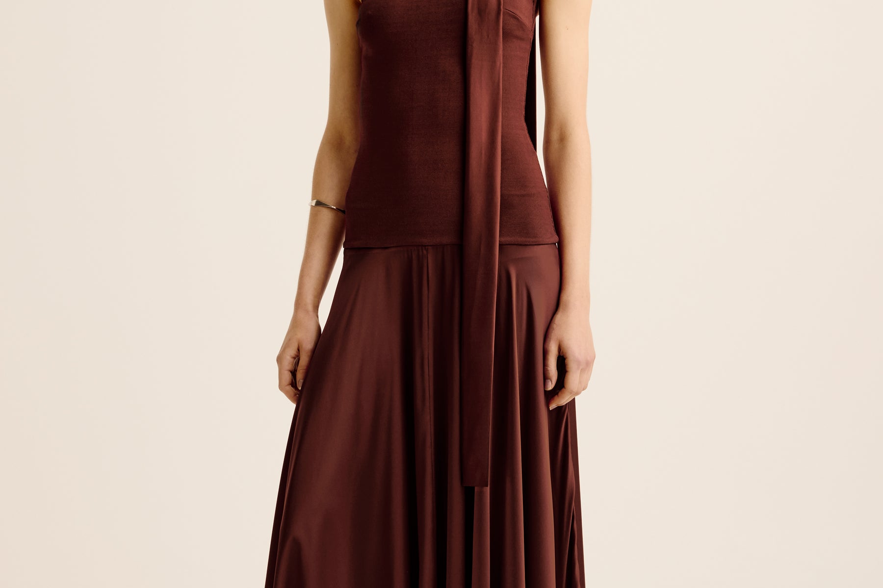 Now reimagined with more luxe, evening styling — an elegant yet effortless occasion piece featuring a stretch knit upper bodice and a dramatic full silk skirt silhouette.