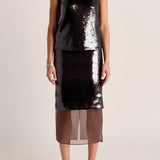 Rendered in espresso-toned sequins that catch the light with subtle intensity, the Luminessa Top skims the body with ease. Finished with an elegant cowl back framed in tonal organza, it’s a refined statement designed for elevated evening styling.