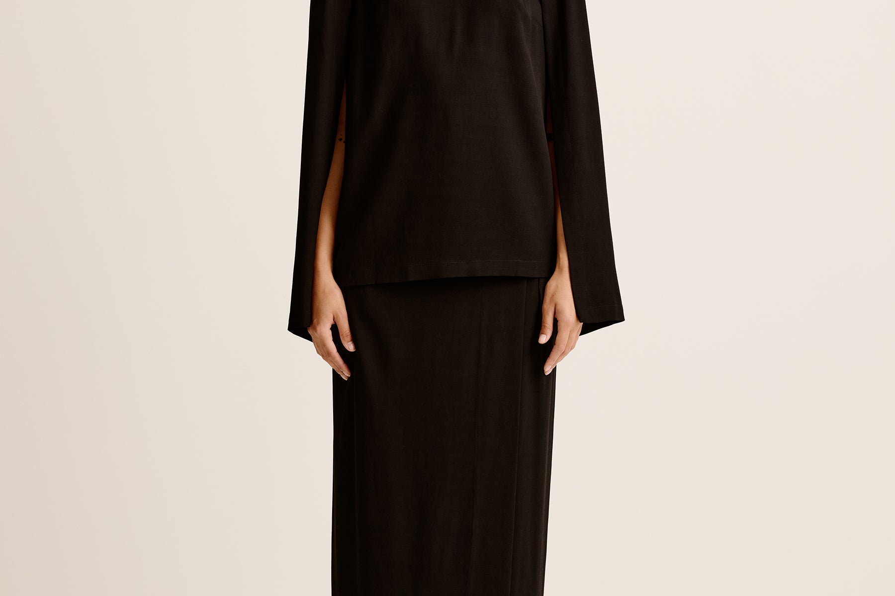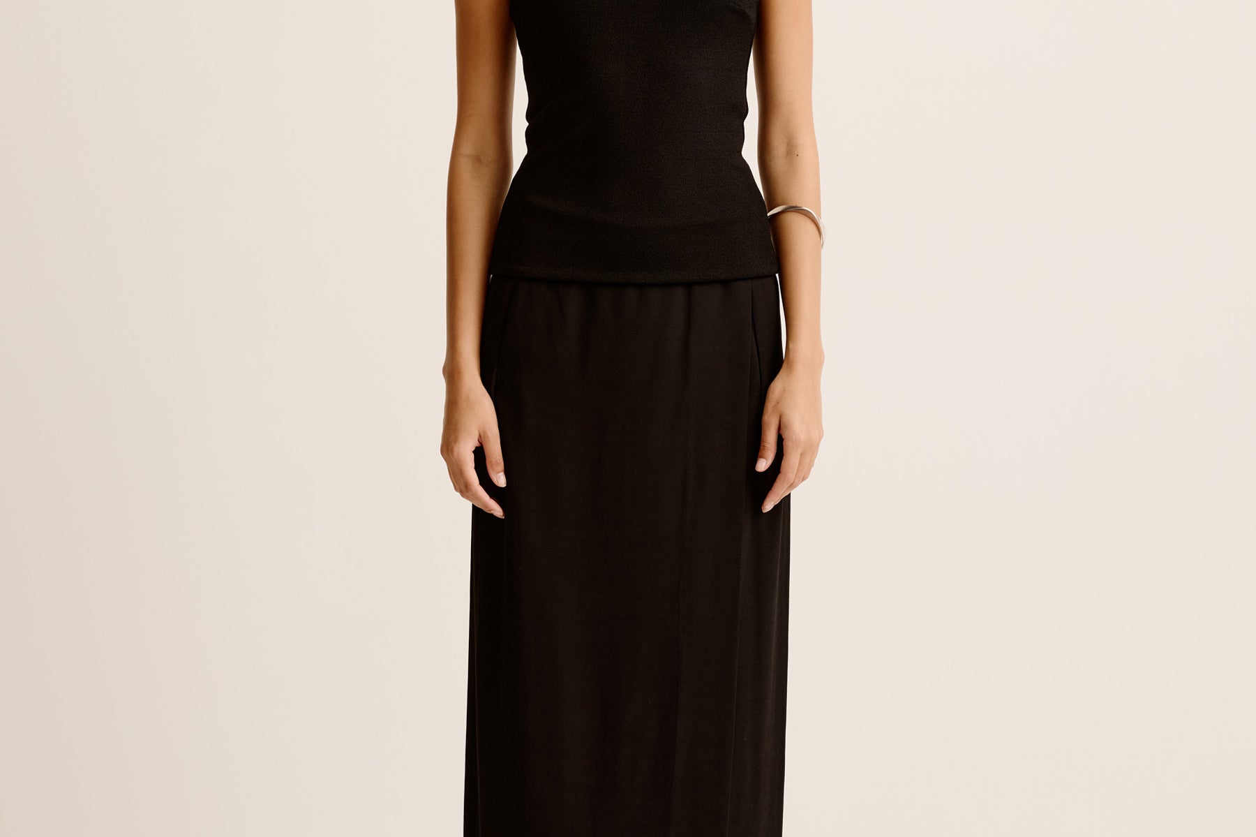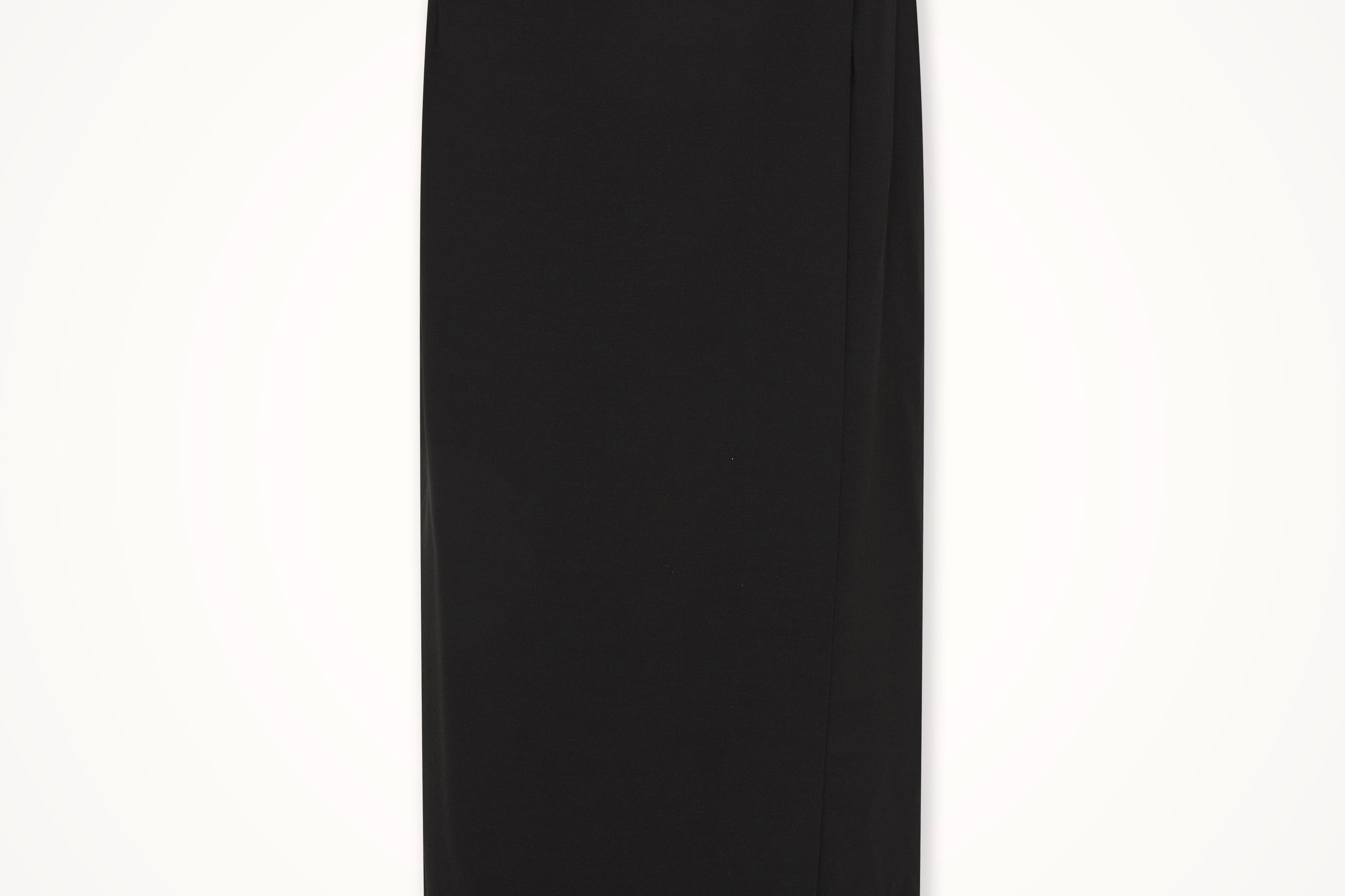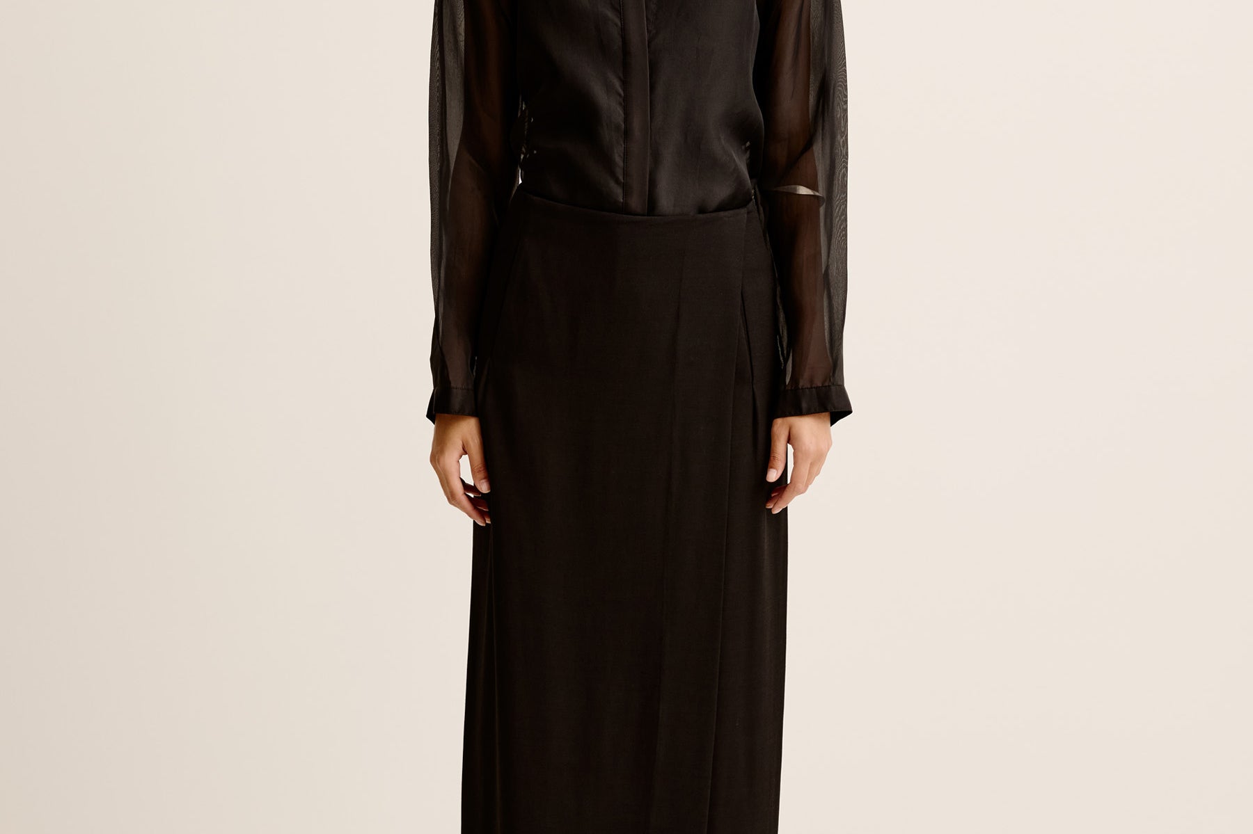 A minimalist, effortless midi skirt with wrap-front detail. Refined and subtly tailored. A modern wardrobe ESSEntial.