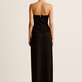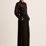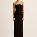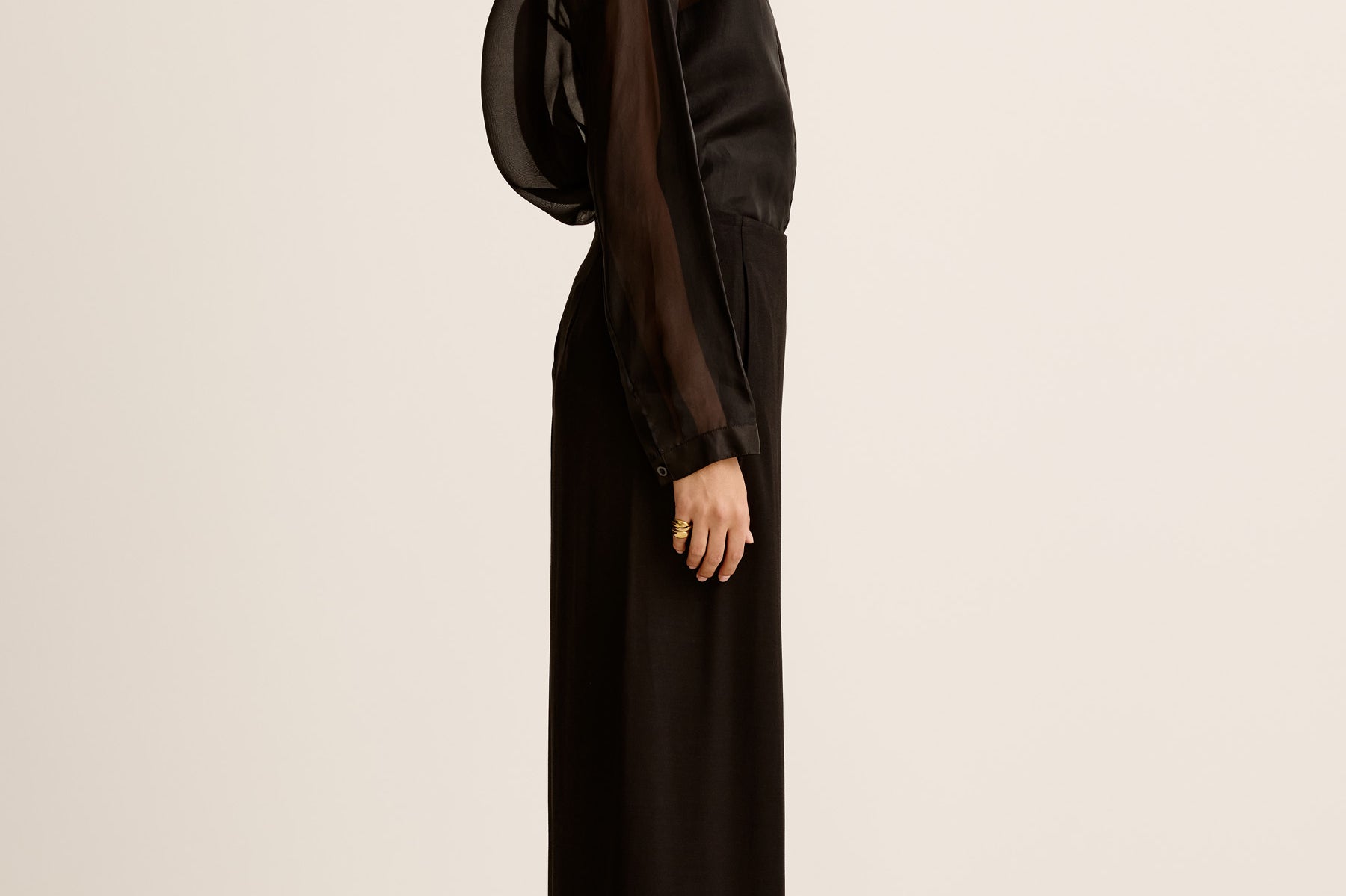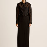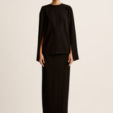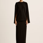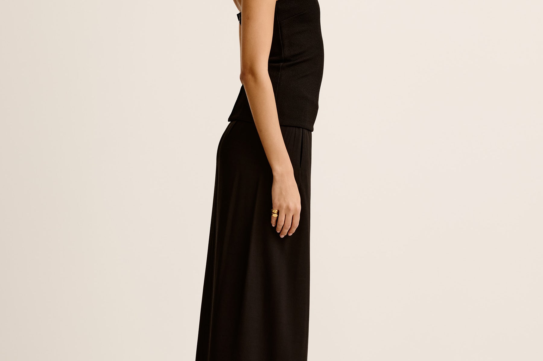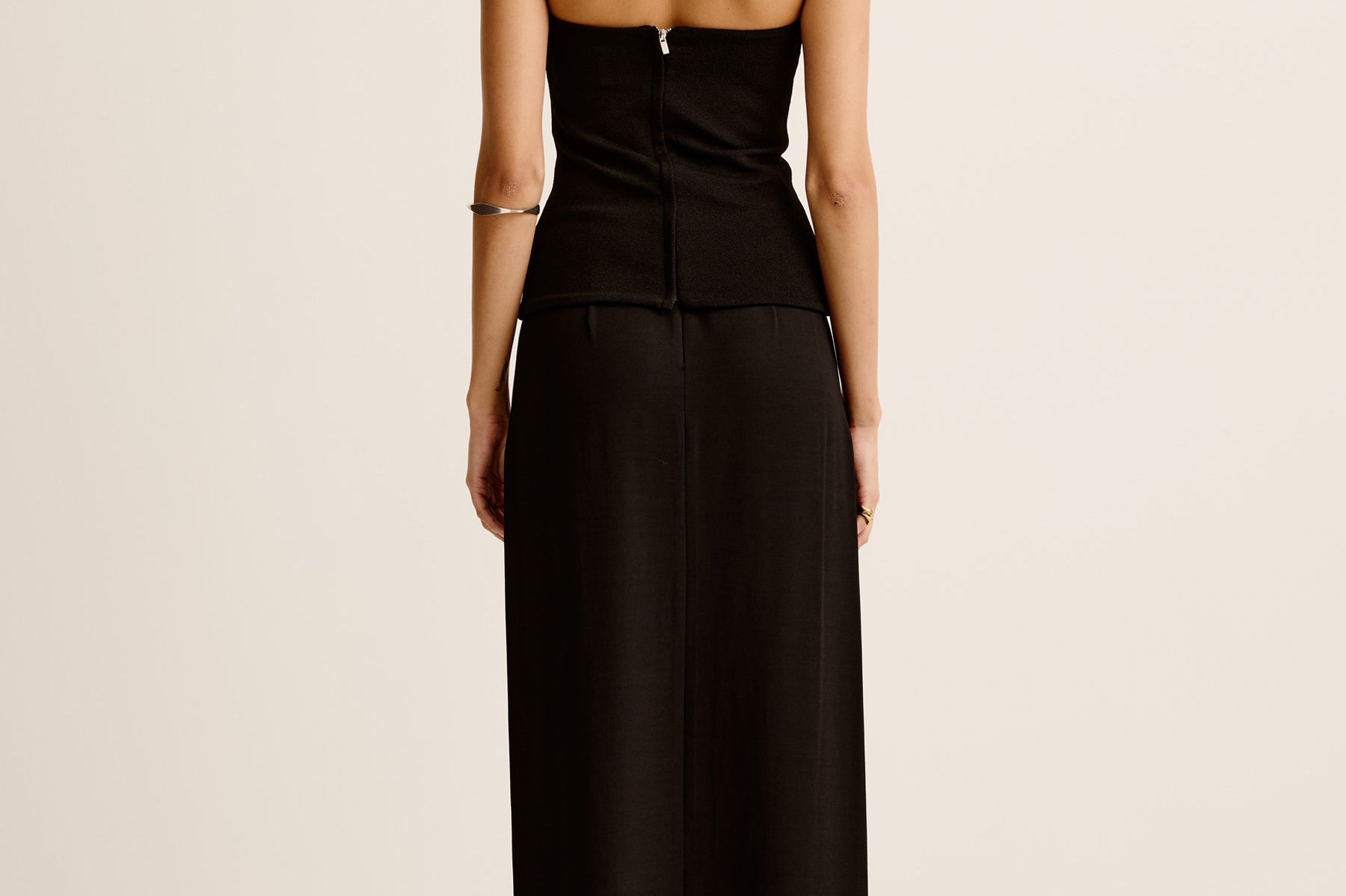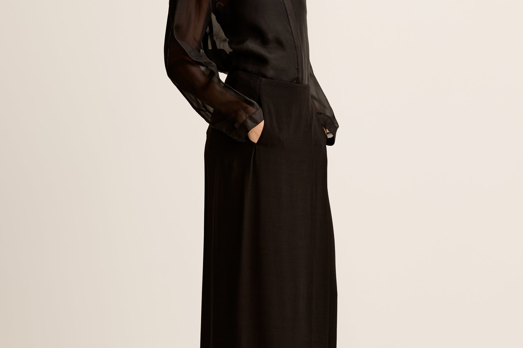 A minimalist, effortless midi skirt with wrap-front detail. Refined and subtly tailored. A modern wardrobe ESSEntial.