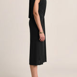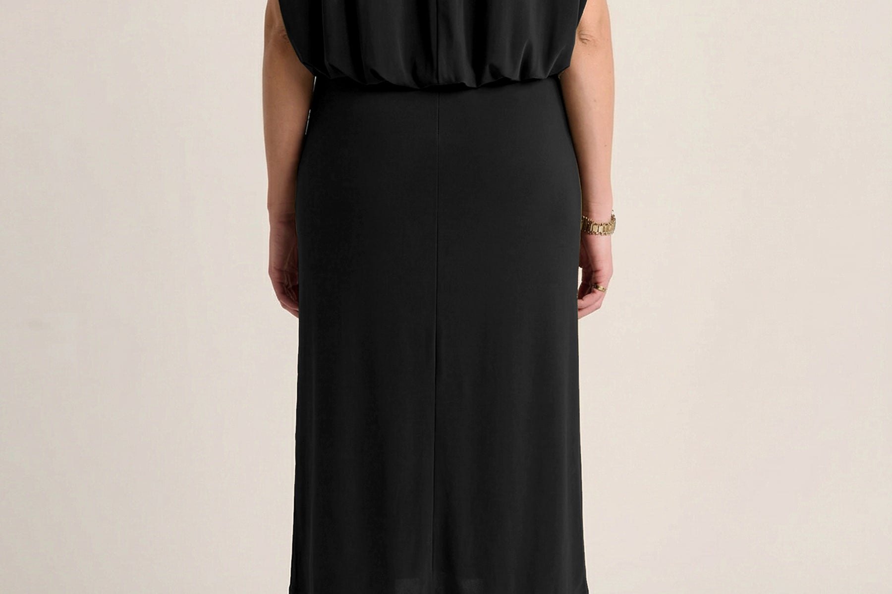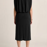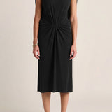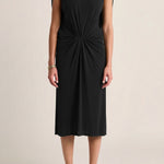 This sculptural dress pairs soft ruching through the center with a high neckline and a flowing cape back, creating a refined interplay of structure and movement. Elegant, grounded, and quietly sensual.