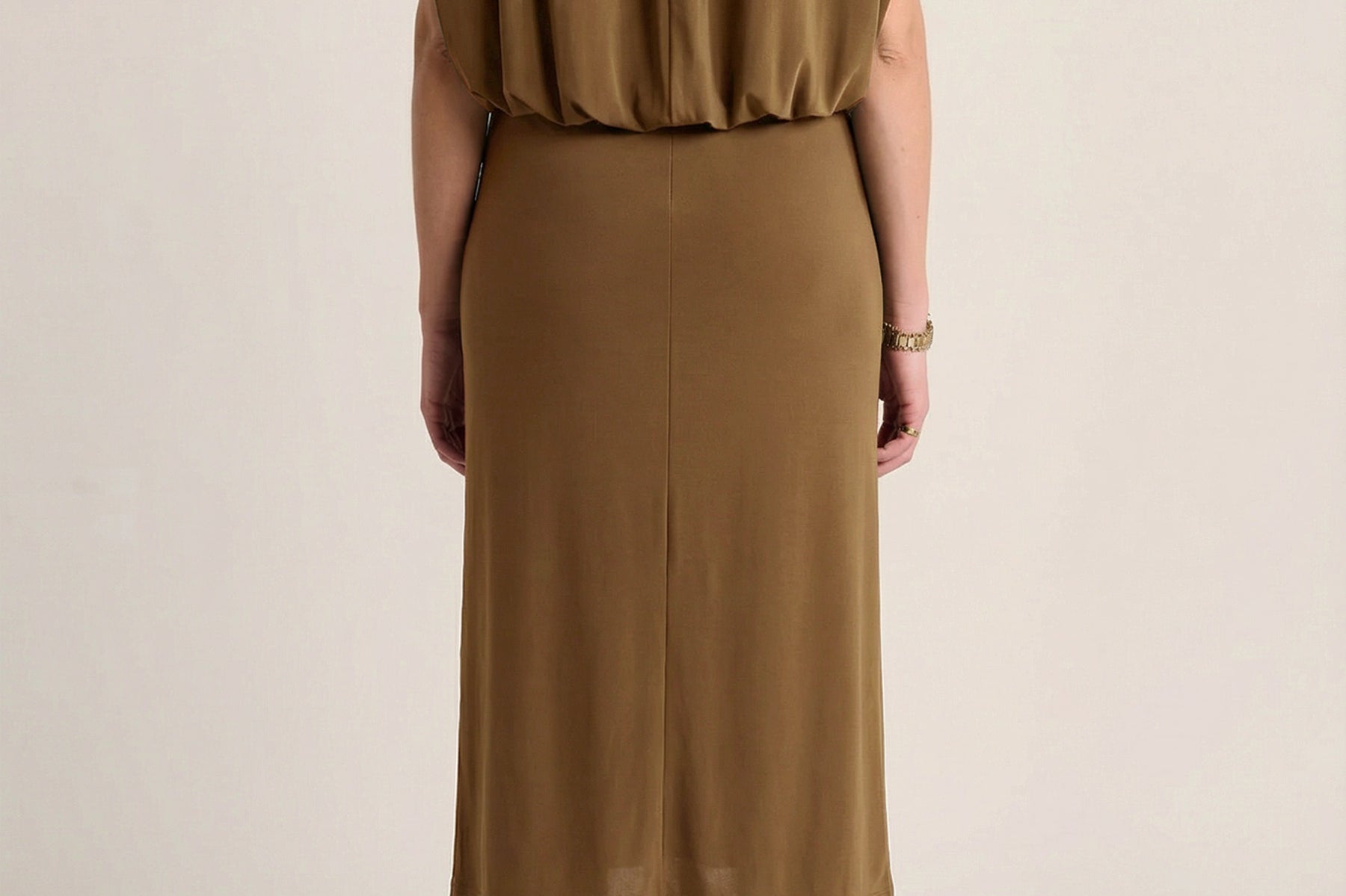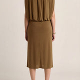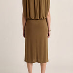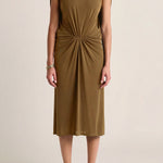 This sculptural dress pairs soft ruching through the center with a high neckline and a flowing cape back, creating a refined interplay of structure and movement. Elegant, grounded, and quietly sensual.