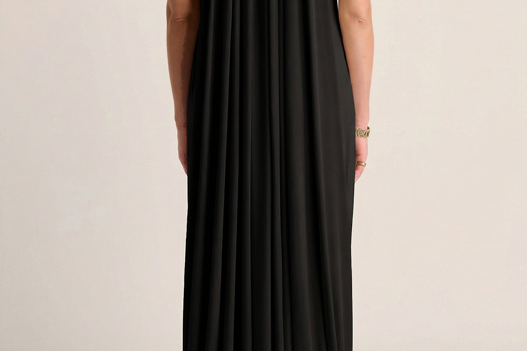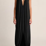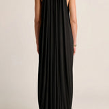 A slinky, fluid jersey dress defined by soft, dramatic drapery and gathered detailing. Designed to skim the body with quiet confidence, it delivers elevated ease for an understated evening moment.