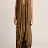 A slinky, fluid jersey dress defined by soft, dramatic drapery and gathered detailing. Designed to skim the body with quiet confidence, it delivers elevated ease for an understated evening moment.