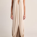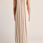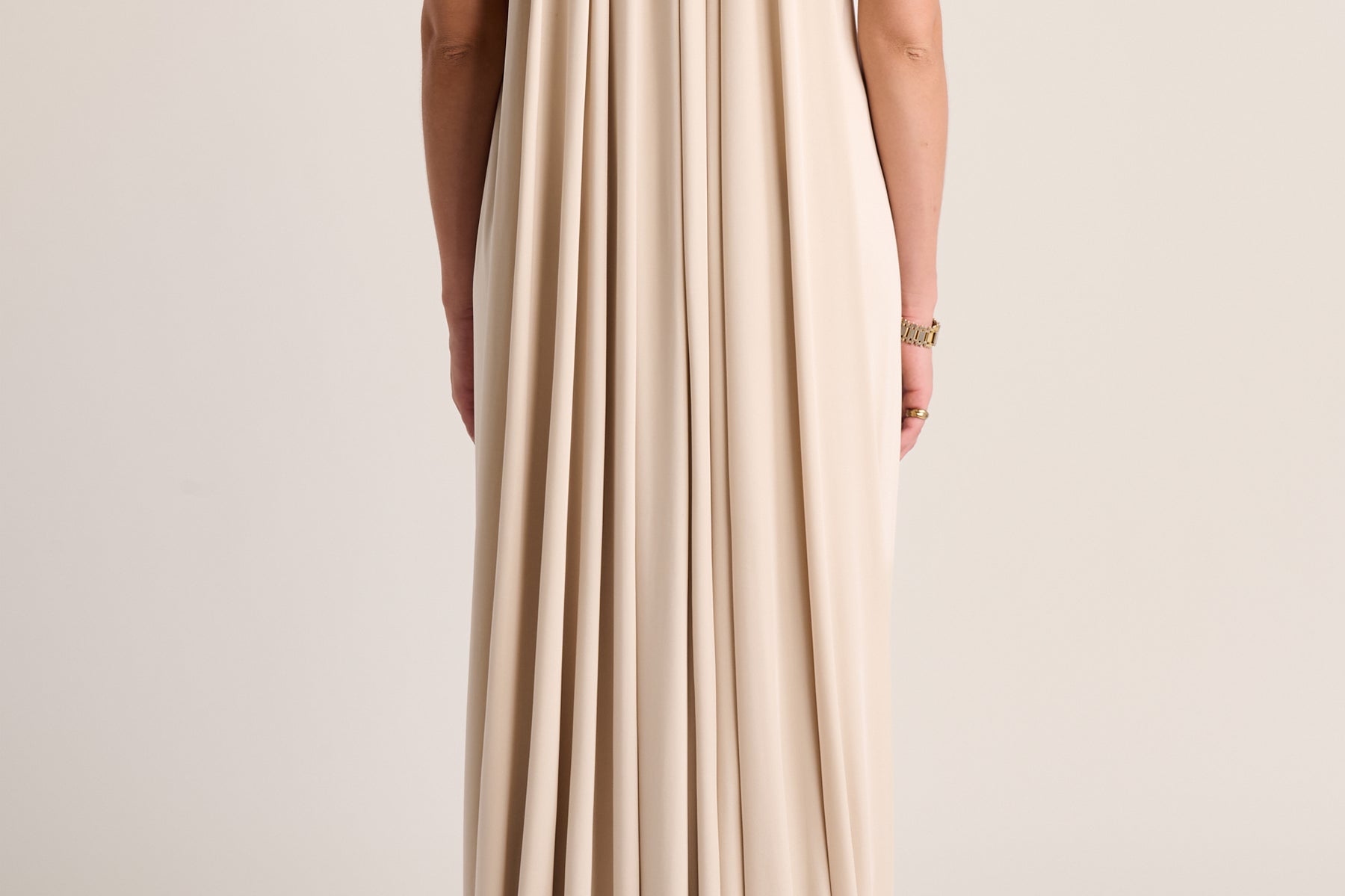 A slinky, fluid jersey dress defined by soft, dramatic drapery and gathered detailing. Designed to skim the body with quiet confidence, it delivers elevated ease for an understated evening moment.