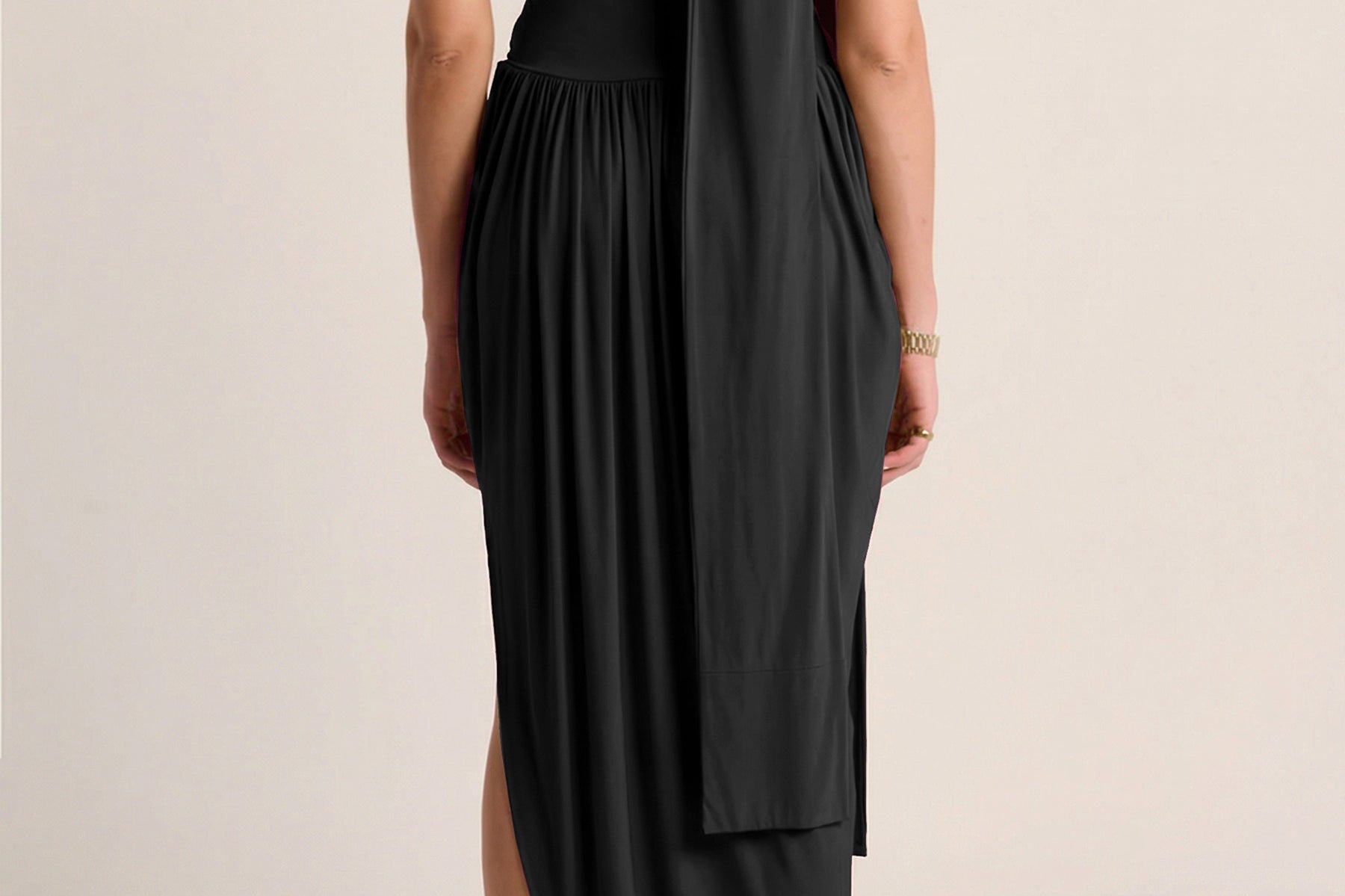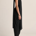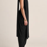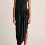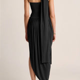 Rendered in soft, flowing jersey, this strapless dress features a fitted bodice and an elegantly angled drape skirt. Finished with a delicate neck tie that can be worn on or removed, it delivers a refined, sculptural silhouette with quiet ease.